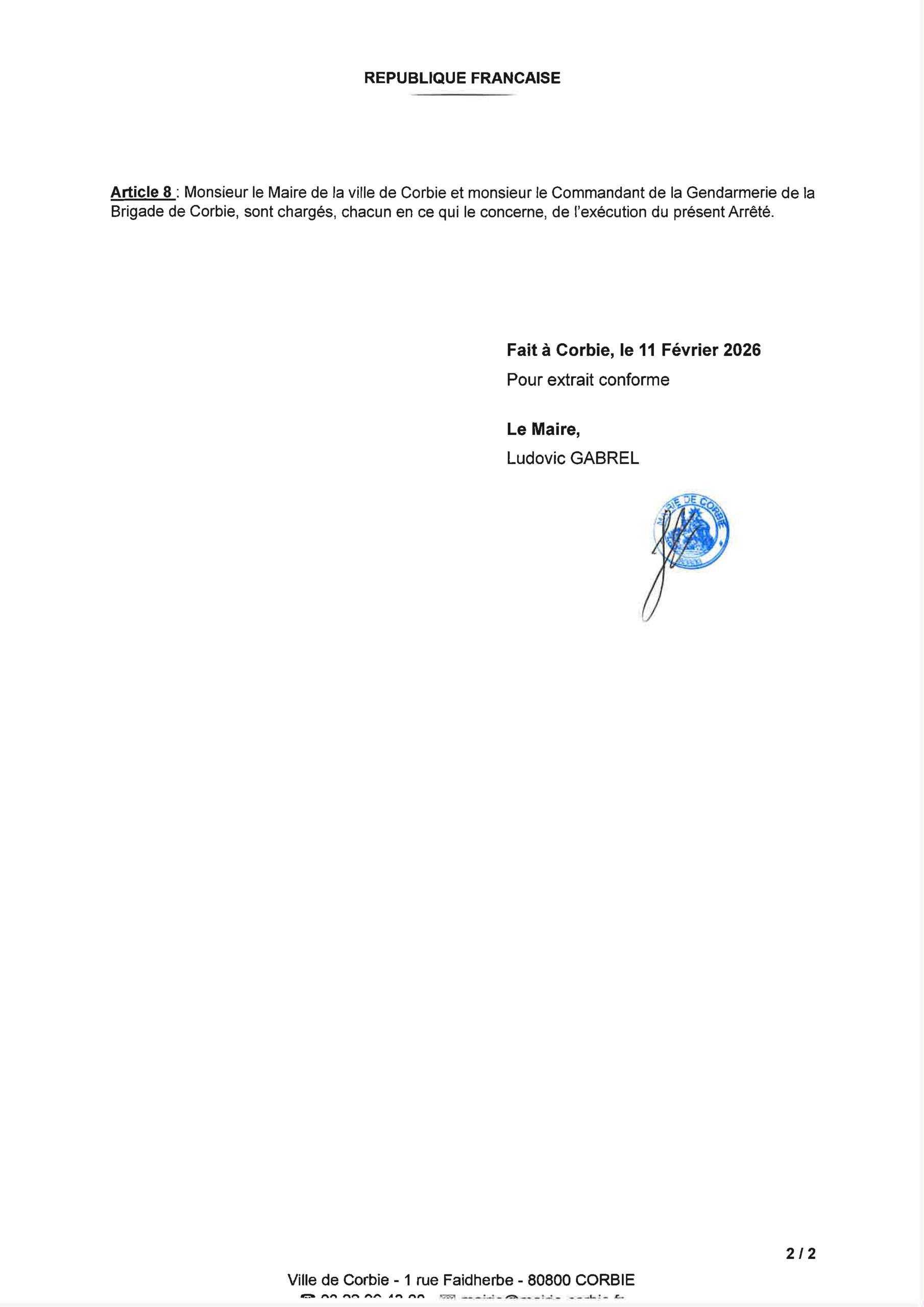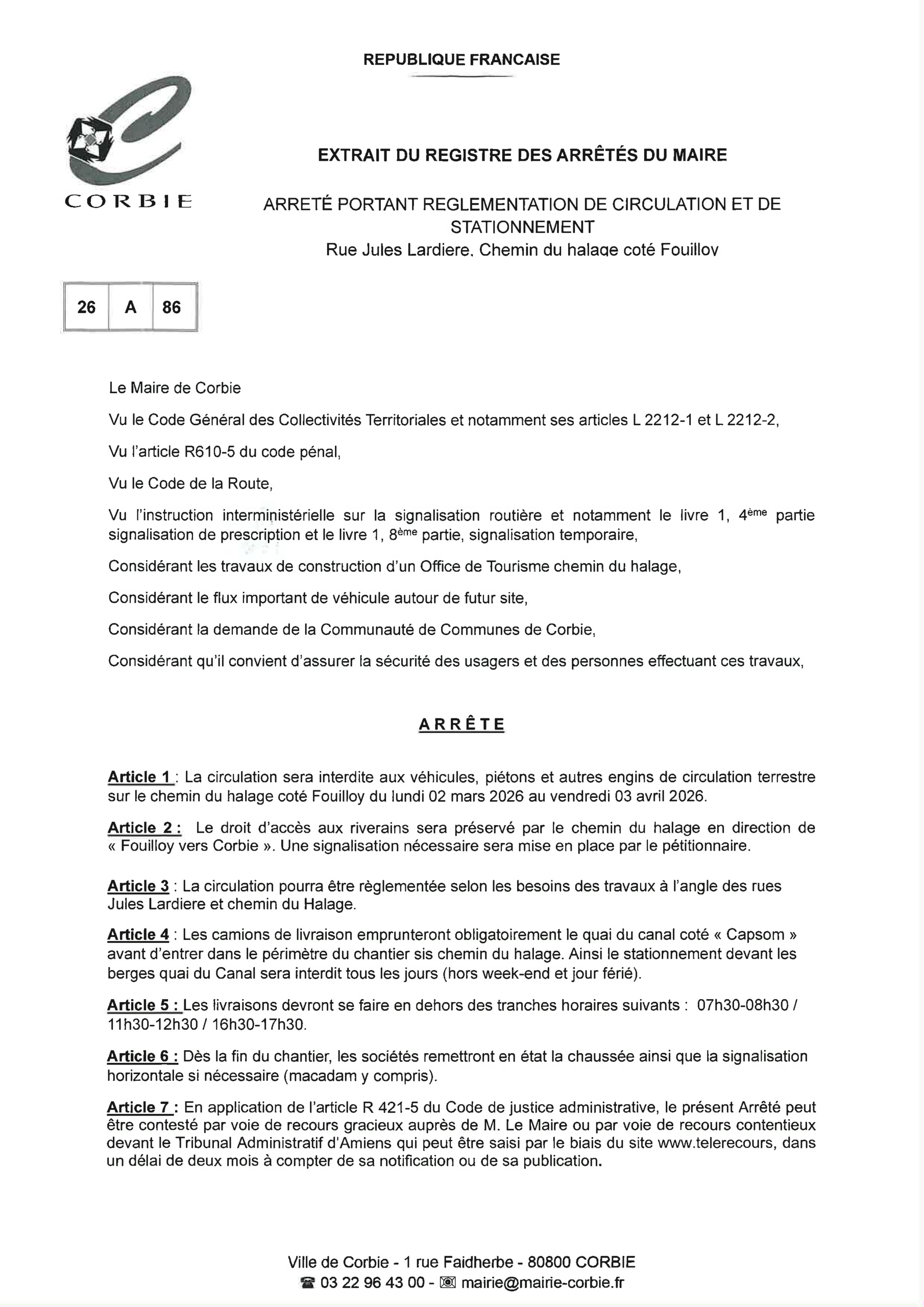 Arrêté – Circulation et stationnement Rue Jules Lardière et Chemin du halage (côté Fouilloy) – Février 2026