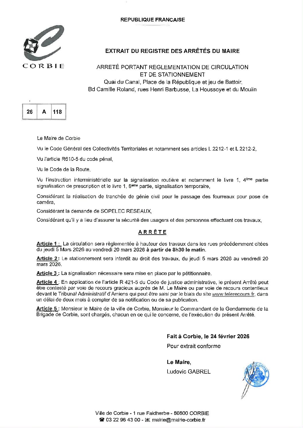 Arrêté – Circulation et stationnement Quai du Canal, Pl. de la République, Jeu de battoir, Bd. Camille Roland, rues Henri Barbusse, La Houssoye et du Moulin – Mars 2026