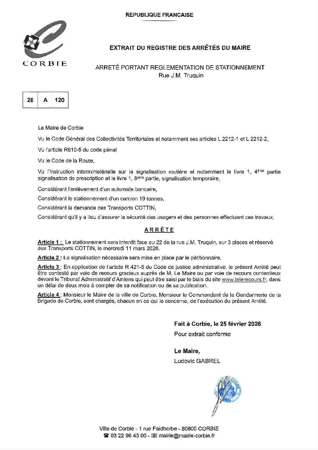 Arrêté – Stationnement rue JM Truquin – Mars 2026