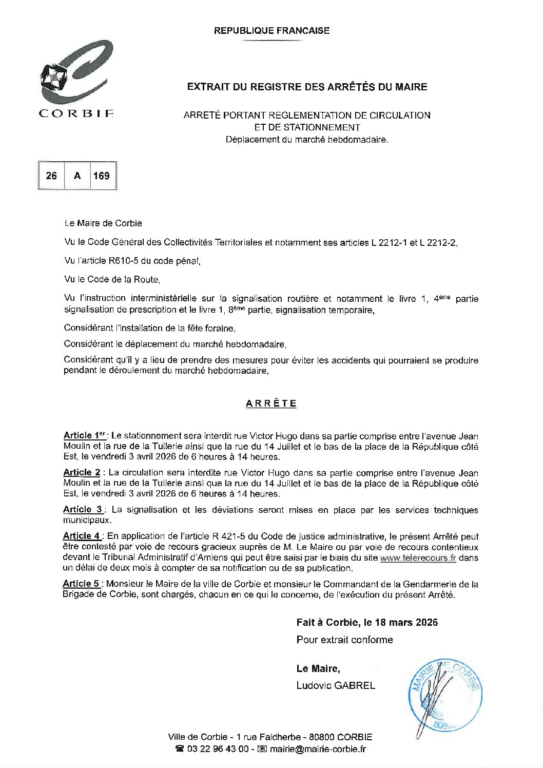 Arrêté – Circulation et stationnement Marché hebdomadaire – Avril 2026