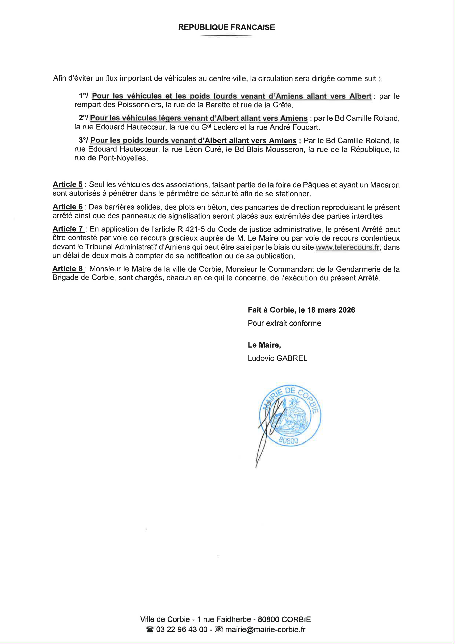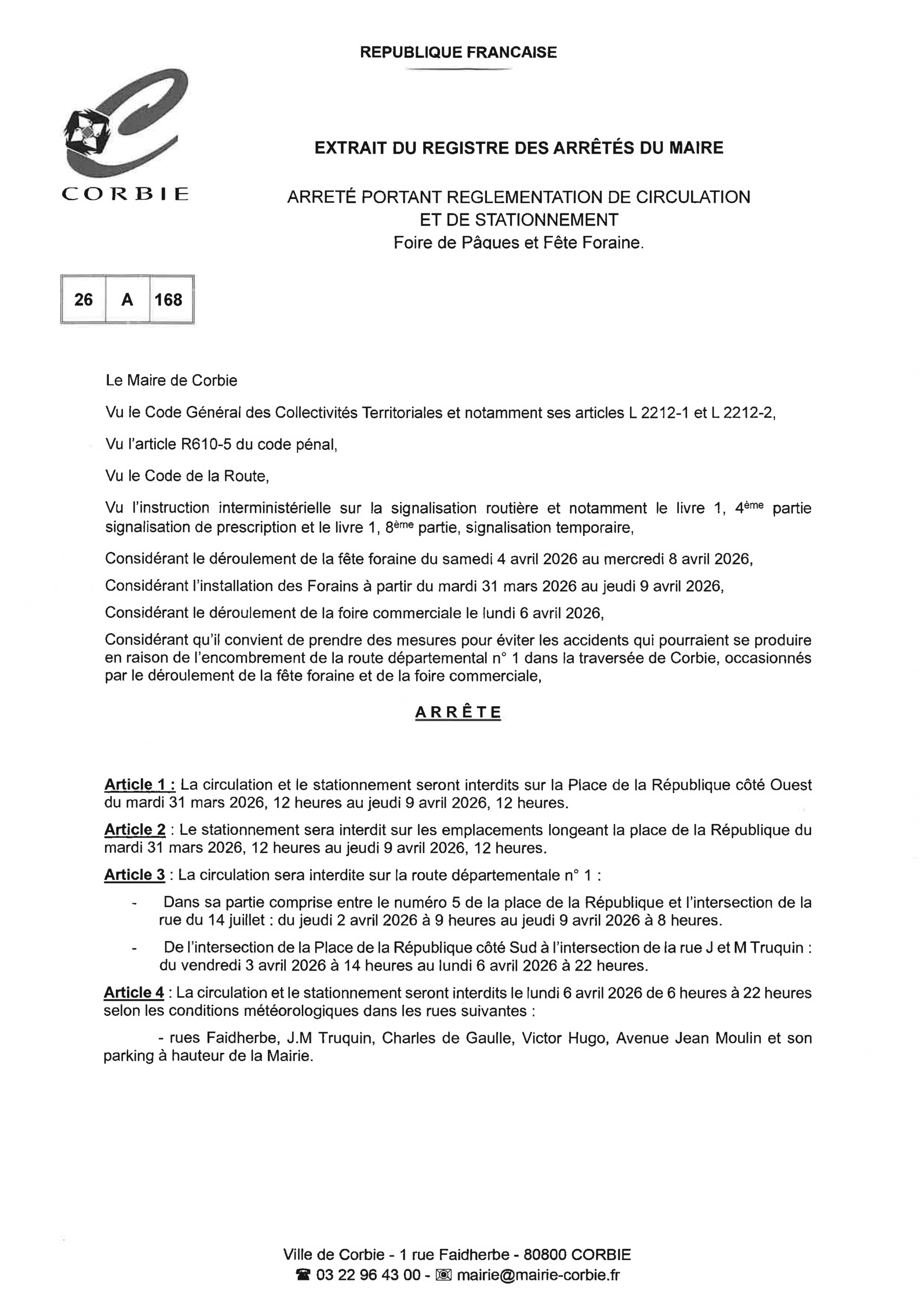 Arrêté – Circulation et stationnement Foire de Pâques – Avril 2026