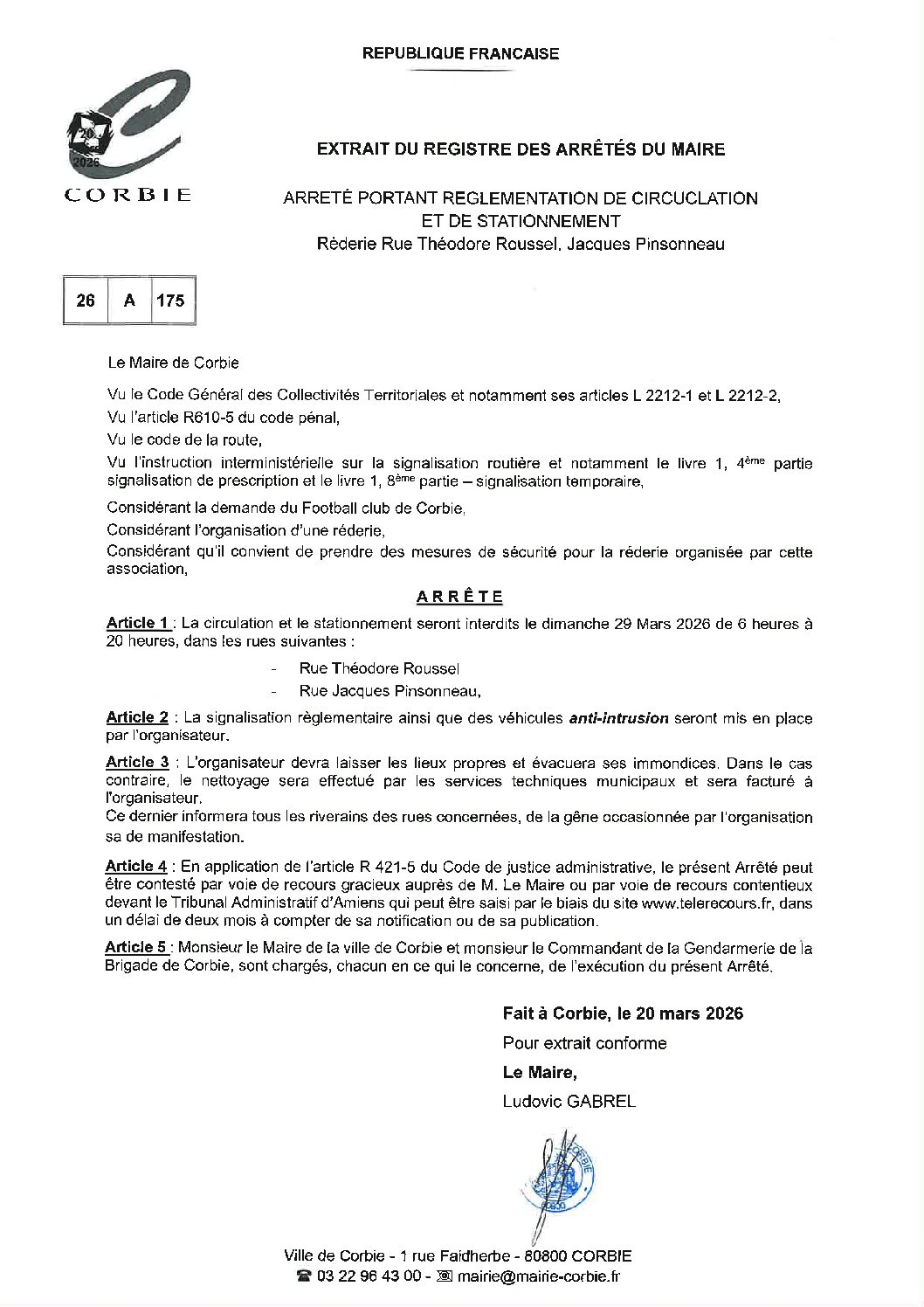 Arrêté – Circulation et stationnement rues Théodore Roussel et Jacques Pinsonneau – Mars 2026