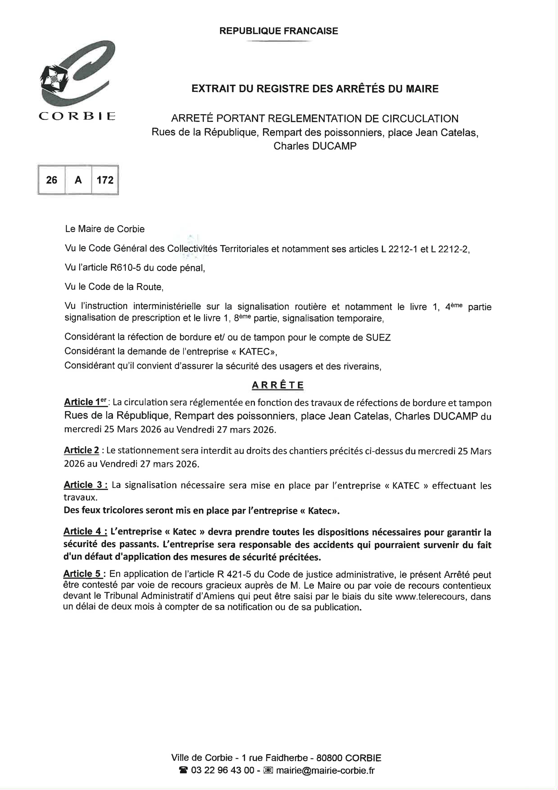 Arrêté – Circulation rues de la République, Rempart des poissonniers, place Jean Catelas et Charles Ducamp – Mars 2026
